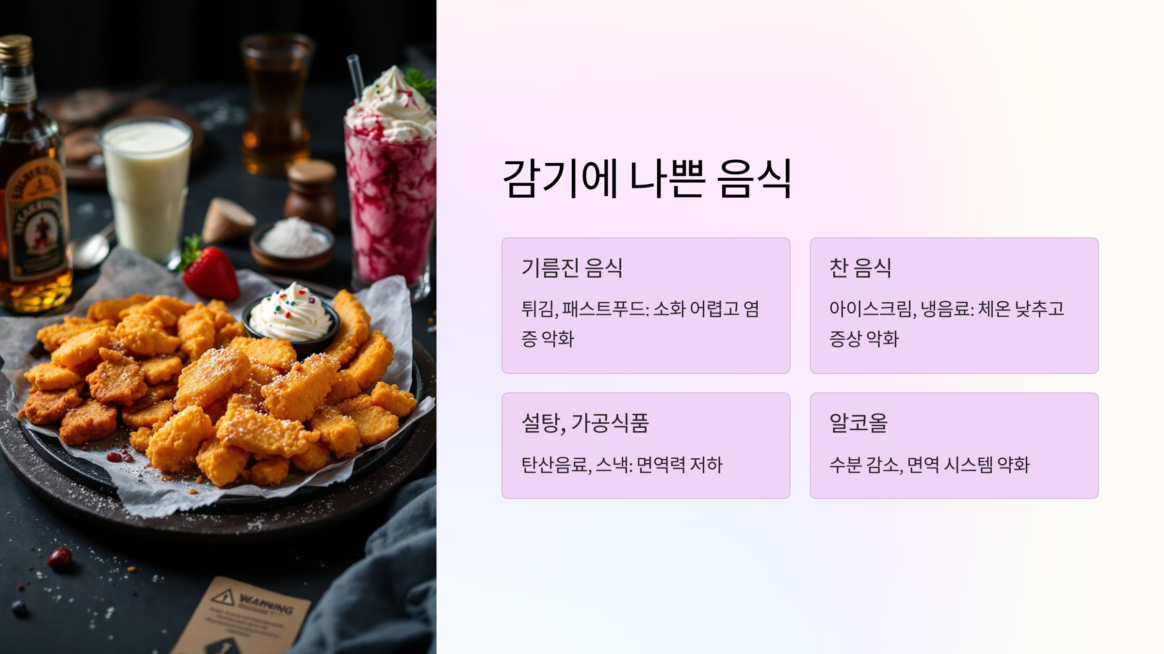 - 찬 음식은 체온을 낮춰 혈액순환을 방해하고, 감기 증상을 악화시킬 수 있습니다.