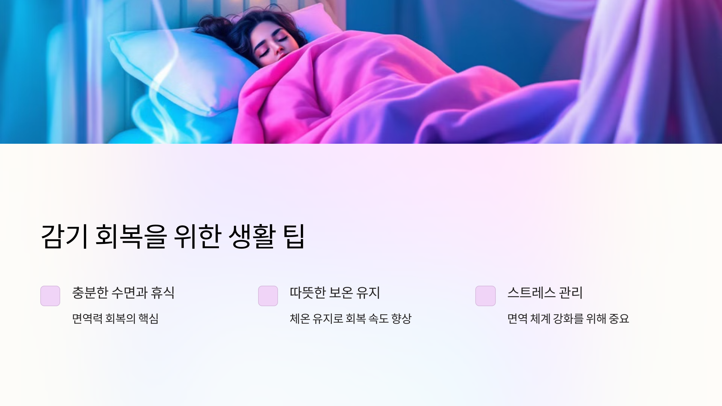 - 충분한 수면과 휴식: 잠은 면역력 회복의 핵심입니다.