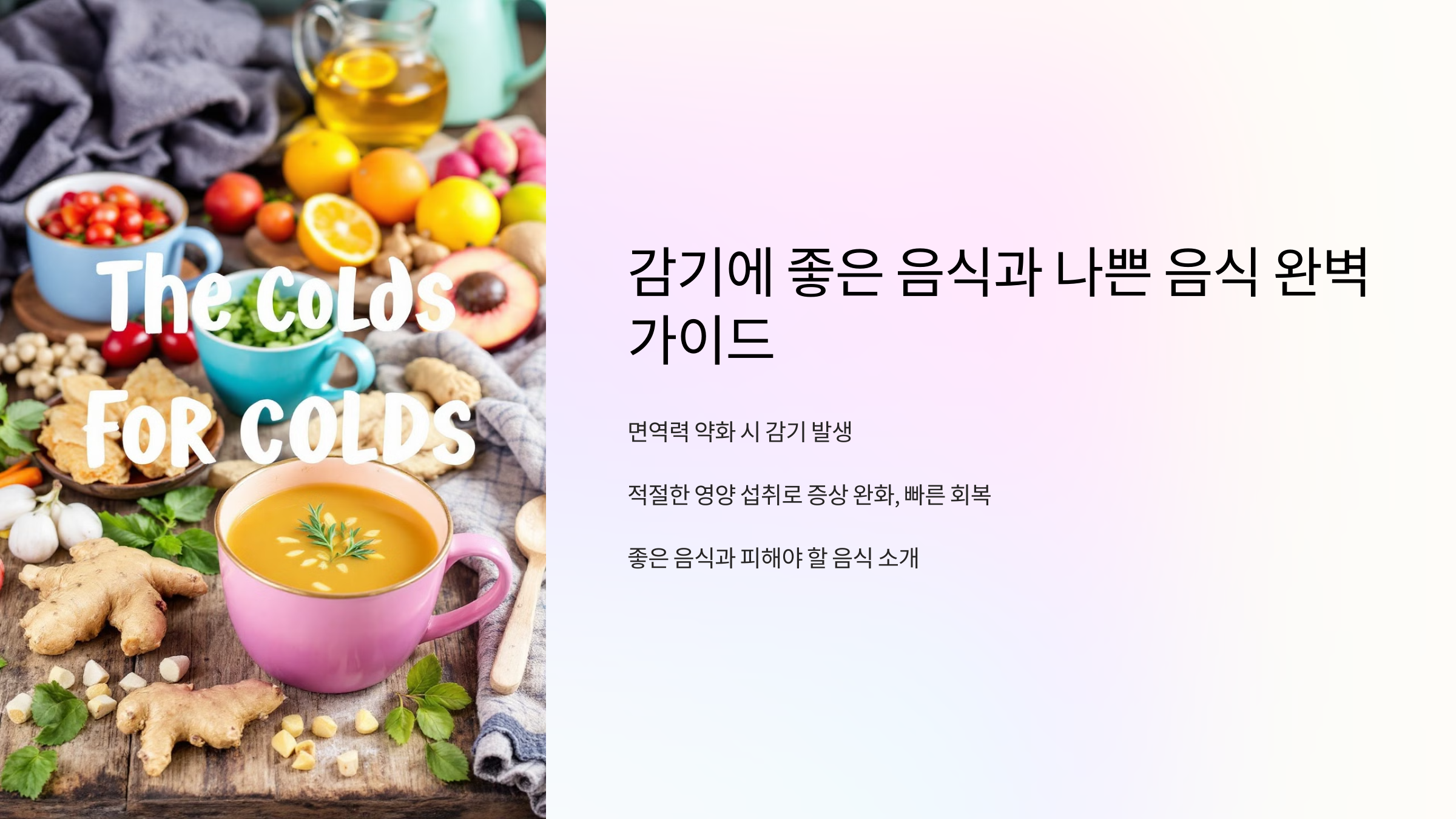 감기는 면역력이 약해졌을 때 쉽게 걸리며, 적절한 영양 섭취가 증상을 완화하고 빠른 회복에 도움을 줄 수 있습니다. 이 글에서는 감기에 좋은 음식과 피해야 할 음식, 그리고 왜 그런지까지 자세히 다뤄보겠습니다.