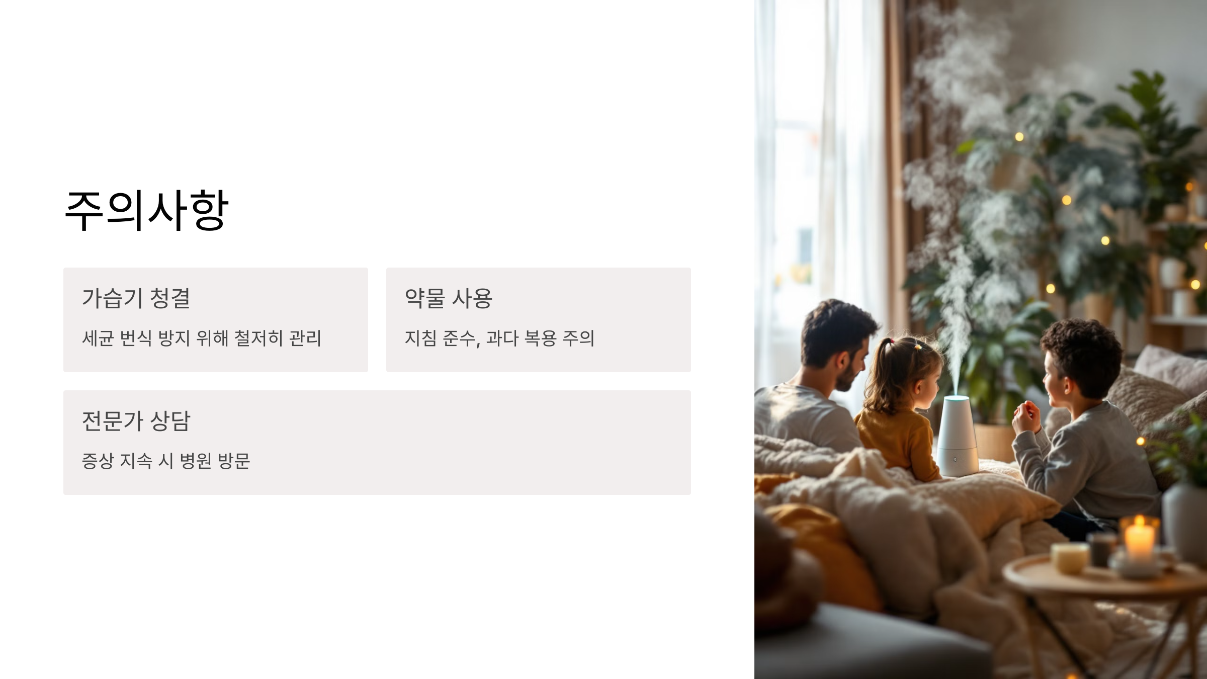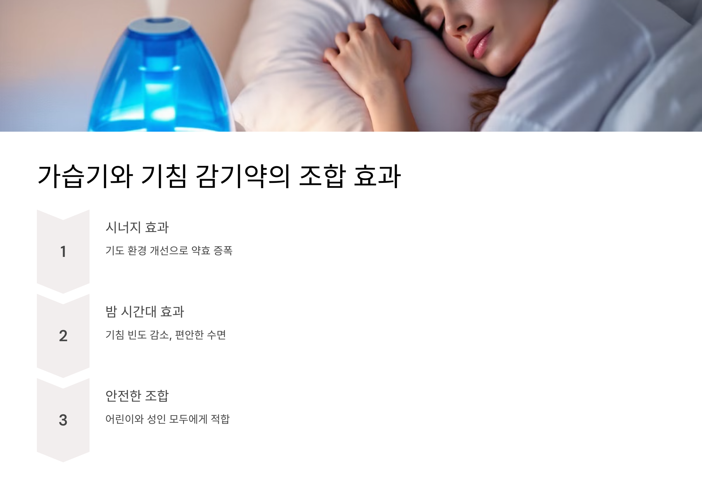 • 약물이 직접적인 증상 완화를 돕는 동시에 가습기가 호흡기 상태를 개선.