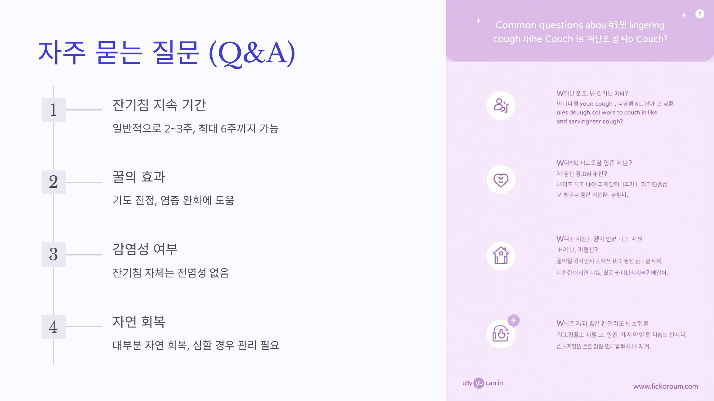 A4. 대부분의 경우 자연적으로 회복됩니다. 하지만 기침이 일상생활에 영향을 줄 정도라면 적극적인 관리가 필요합니다.