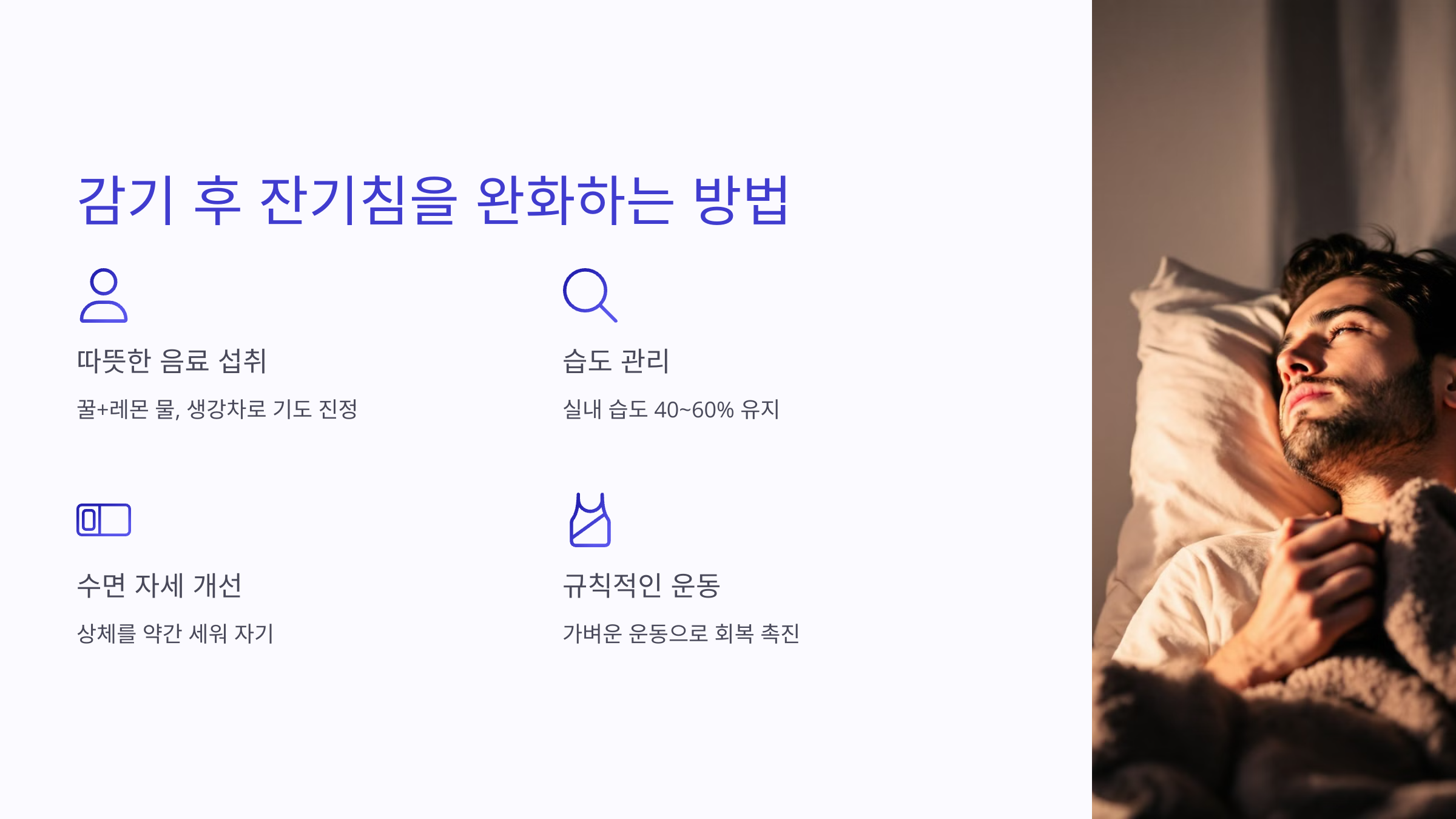 밤에 기침이 심하다면, 베개를 추가로 사용해 상체를 약간 세우는 자세로 자면 도움이 됩니다. 이는 후비루 증상을 완화하고, 기침 반사를 줄여줍니다.