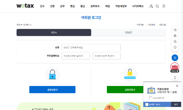공인인증서 및 간편인증서로 편한 방법으로 로그인을 진행하시면 됩니다.