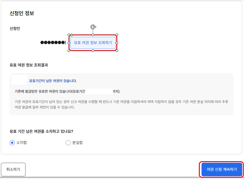 유효 여권 정보 조회하기를 클릭하면 기존에 사용 중인 여권의 유효기간을 확인 할 수 있습니다.