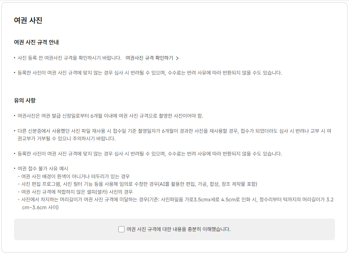 6. 여권 사진에 대한 안내 내용을 읽은 후 아래 [여권 사진 규격에 대한 내용을 충분히 이해했습니다.]에 체크를 한 후 여권 사진을 업로드 합니다.