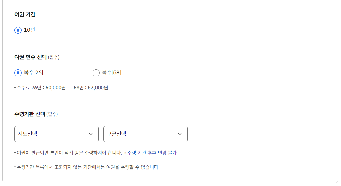 여권 면수 선택, 수령기관을 선택합니다.