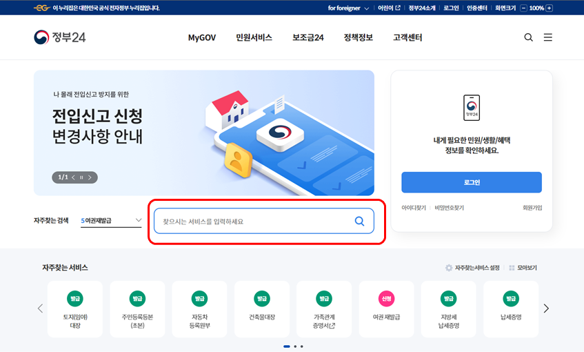 1. 정부24 사이트에 접속한 후 로그인을 진행 합니다.