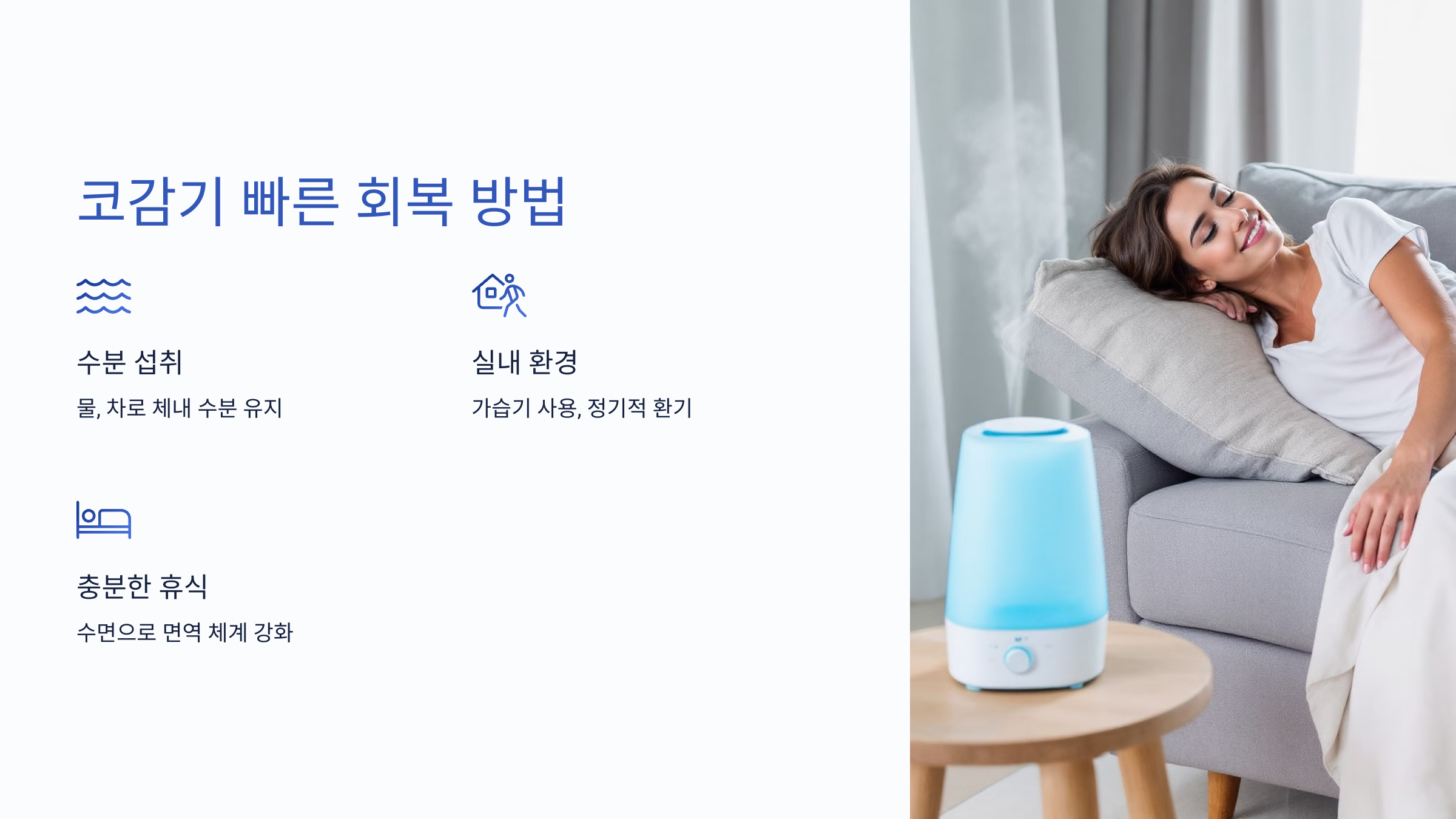 - 가습기 사용: 건조한 공기는 코 점막을 자극합니다. 가습기를 사용해 적정 습도를 유지하세요.