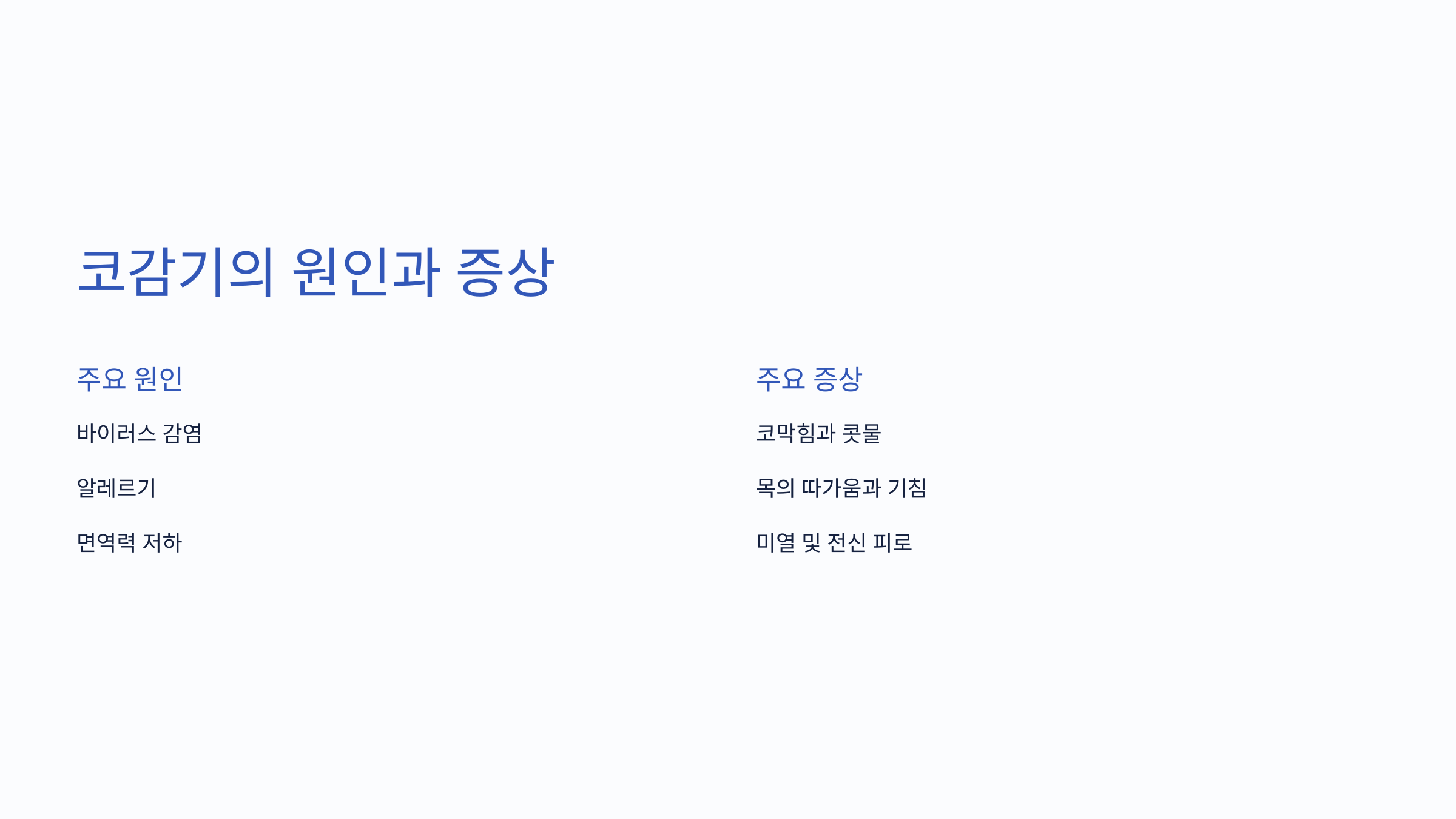 코감기는 주로 코막힘, 콧물, 재채기 증상이 두드러지는 반면, 일반 감기는 기침, 목 통증, 미열 등의 증상이 포함됩니다.