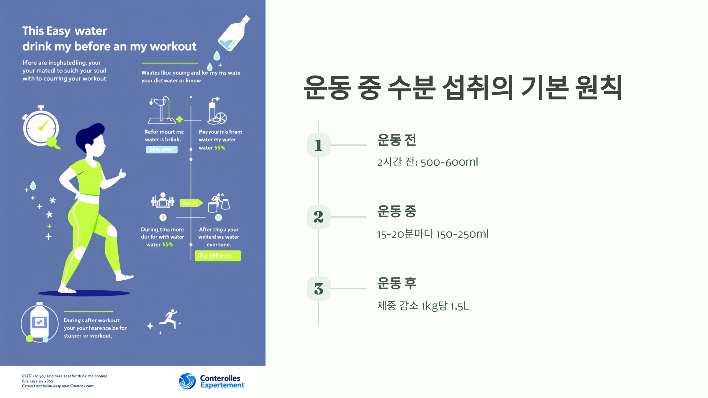 - 운동 직전: 약 250~300ml의 물을 추가로 섭취하면 갈증을 예방할 수 있습니다.