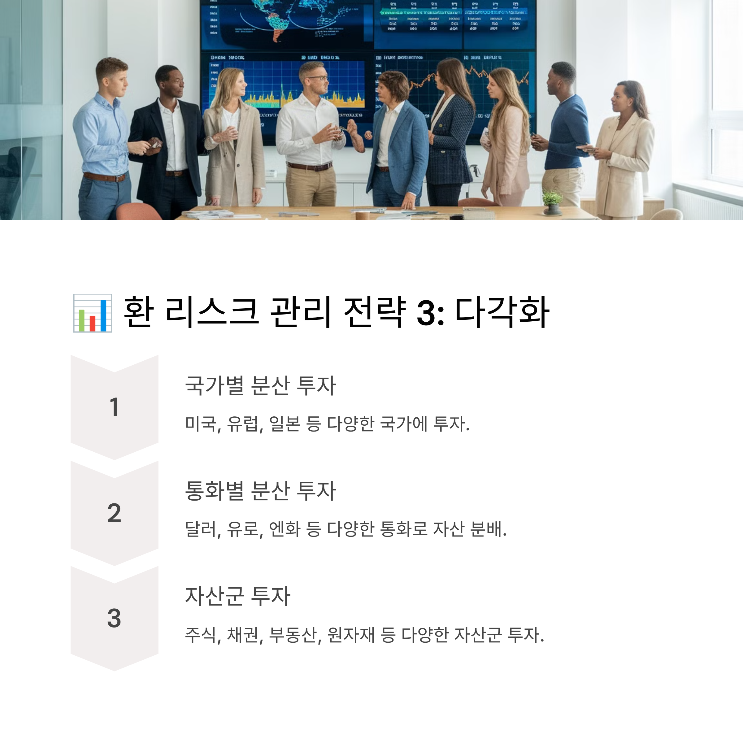 환율 변동 리스크를 줄이기 위해서는 투자 지역과 통화를 분산시키는 것이 중요합니다. 특정 국가의 환율 변동에 따른 손실을 최소화하려면 아래와 같은 다각화 전략을 고려해야 합니다.