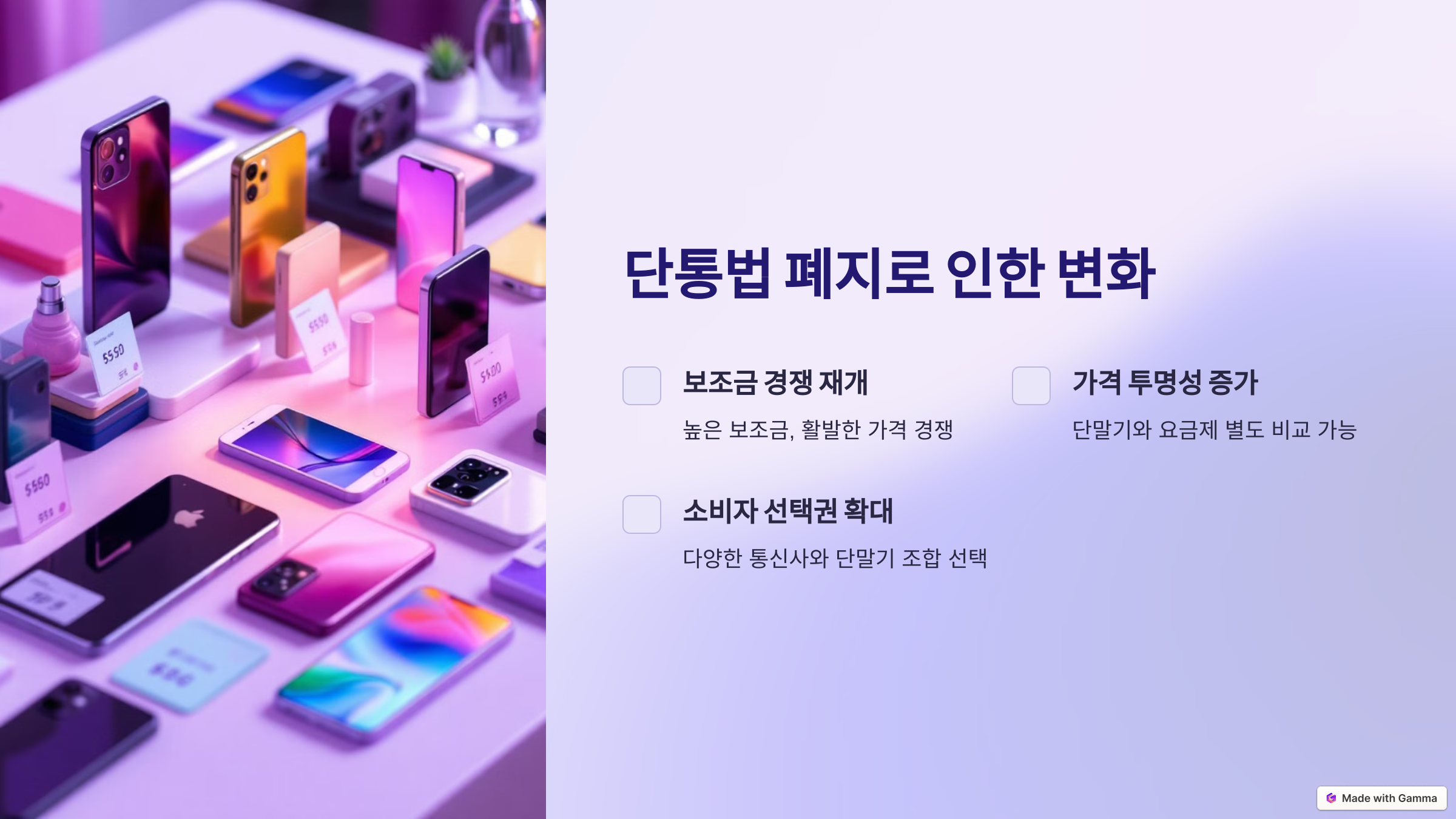 📌 "단통법 폐지로 스마트폰 시장과 소비자에게 미칠 변화와 혜택. 보조금 경쟁의 부활과 선택권 확대로 더 나은 소비자 경험이 기대됩니다."