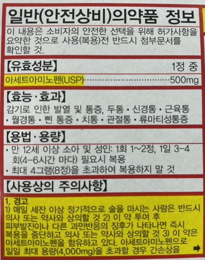 한국에서는 아세트라미노펜 성분으로 되어 있는 진통제는 '타이레놀'이 유일하다고 합니다.