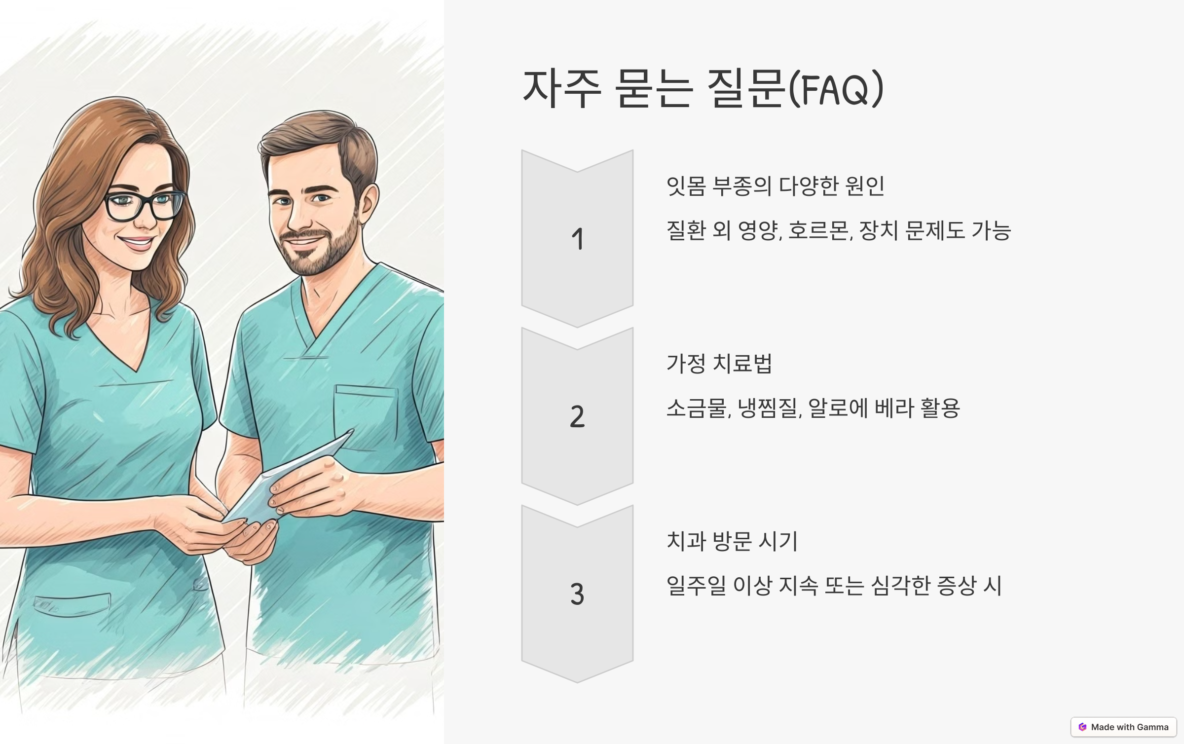 잇몸 부종은 흔한 문제이지만, 그 원인을 정확히 파악하고 적절히 대처하는 것이 중요합니다. 적절한 치료와 예방 습관을 통해 건강한 잇몸을 유지할 수 있으며, 만약 증상이 지속되거나 악화될 경우 즉시 치과를 방문하는 것이 필요합니다. 구강 건강은 전반적인 건강과도 밀접하게 연결되어 있으므로 평소 관리가 무엇보다 중요합니다.