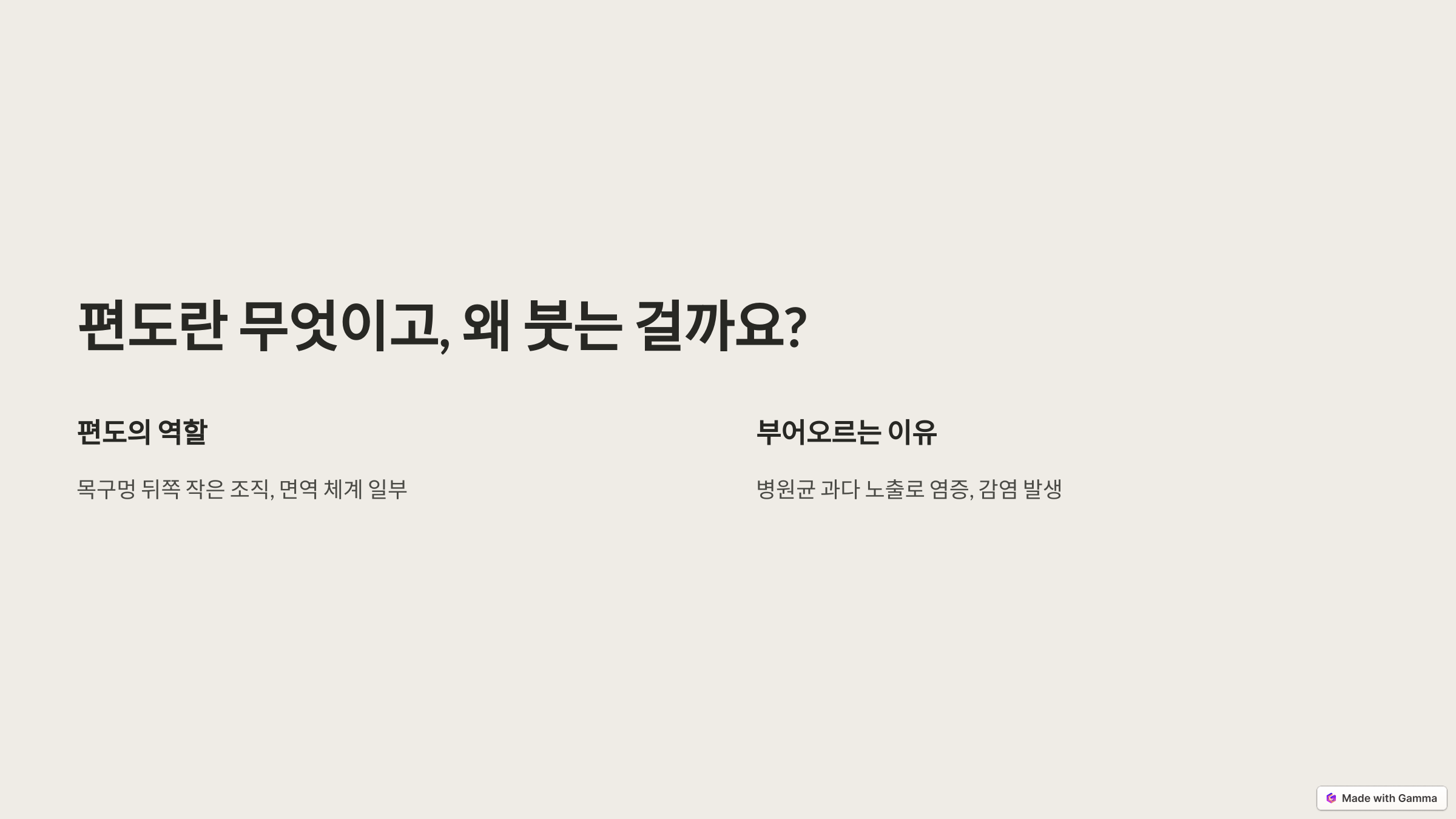 편도는 목구멍 뒤쪽에 위치한 작고 타원형의 조직으로, 면역 체계의 일부로서 박테리아와 바이러스를 포착해 감염으로부터 몸을 보호합니다. 하지만 병원균에 과도하게 노출되면 염증이나 감염이 발생해 부어오를 수 있습니다.