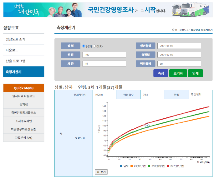 질병관리청 홈페이지에 접속하신 후 '성장상태측정계산기'를 검색하시면 홈페이지 아래에 '성장상태측정계산기'가 나옵니다.