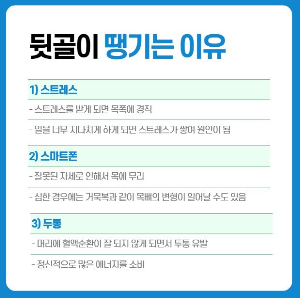 스마트폰과 컴퓨터를 자주 하게 되다보니 이러한 이유로 뒷골이 당기는 느낌을 많이 받을 것 같습니다.