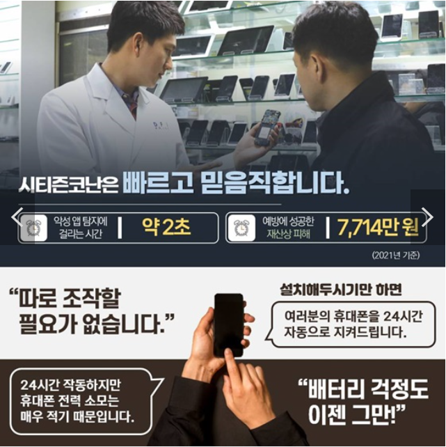 개인정보 빼가는 악성앱 경찰청에서 운영하는 시티즌 코난으로 내 휴대폰 보호해요!