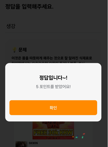 머니워크 돈버는 건강 퀴즈 정답은 "생강"입니다. 오늘은 정답 입력하는 것을 캡쳐 하지 못했네요.