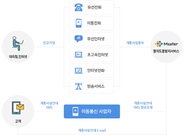 본인 명의로 각종 통신서비스(이동전화, 무선인터넷[WiBro], 유선전화, 초고속인터넷, 인터넷전화[VoIP], 유료방송 등)에 신규로 가입하거나 명의변경을 통해 양도받을 경우 그 사실을 가입자 본인 명의로 사용하고 있는 이동전화 회선을 통해 SMS로 알려주는 서비스입니다.