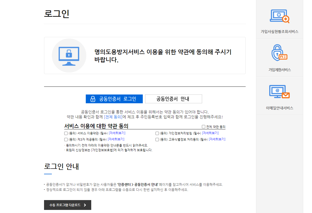 ▷ 서비스 약관에 체크를 한 후 공동인증서로 로그인을 합니다.