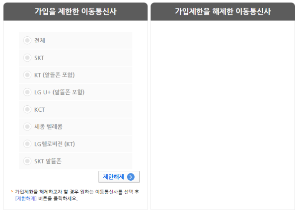 ▷ 가입제한을 해제한 이동통신사에서 원하는 통신사를 선택 후 가입제한 버튼을 클릭합니다.