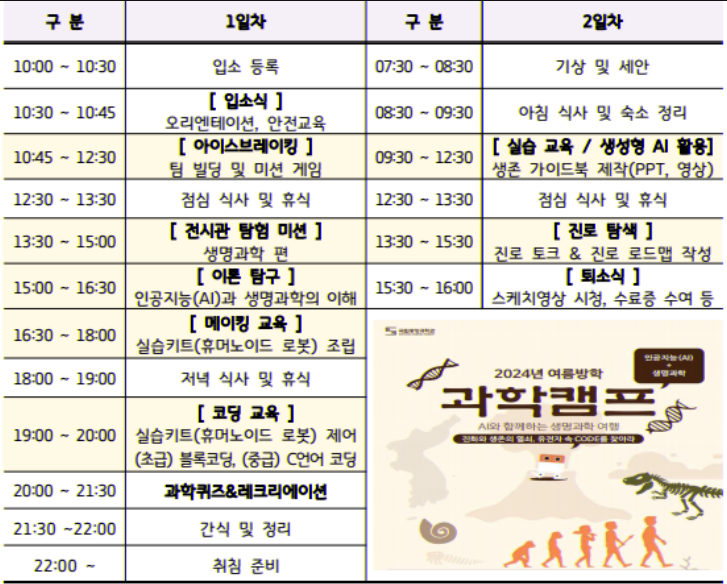 인공지능(AI), 생명과학 관련 전시관 탐험 및 이론 탐구, 코딩 및 실습 교육, 진로 멘토링 등 다양하고 재미있는 프로그램이 준비되어 있습니다.