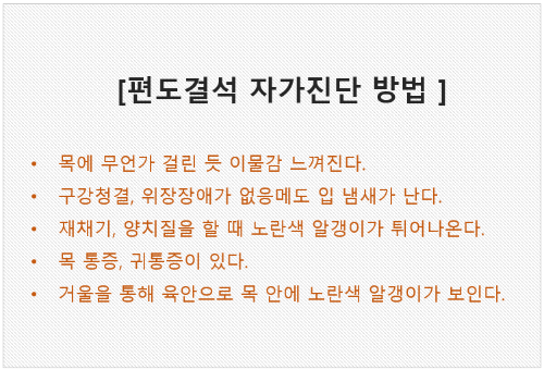목이 답답하다고 느껴지거나 무언가 이질감이 느껴진다 생각 되신다면 제일 먼저 편도결석을 의심해보셔야합니다. 편도결석은 심각한 질환은 아니지만 굉장히 거슬리고 일상생활을 불편하게 만들기도 합니다.
