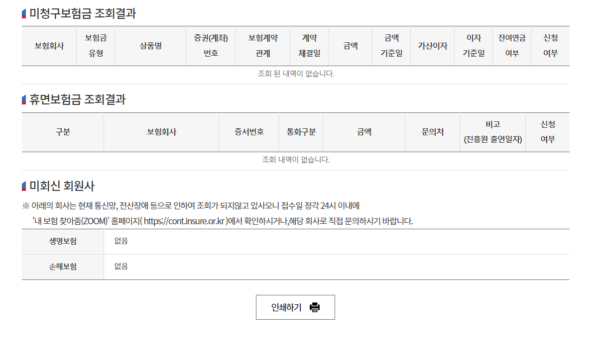 스크롤을 아래로 내리면 '미청구보험금'과 '휴면보험금'도 함께 조회결과를 확인 할 수 있습니다.