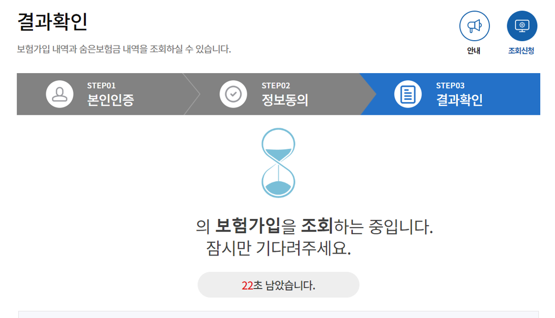 또한 상속인 금융거래조회 서비스 혹은 안심상속 원스톱 서비스를 신청이 되어 있다면 접수번호 입력 및 본인인증을 통해서 망인의 숨은보험금도 조회가 가능합니다. 다만 망인의 숨은보험금의 경우에는 해당 사이트에서 청구가 지원되지 않으므로 해당 보험사에 문의를 해야 합니다.